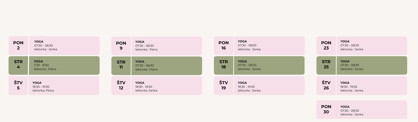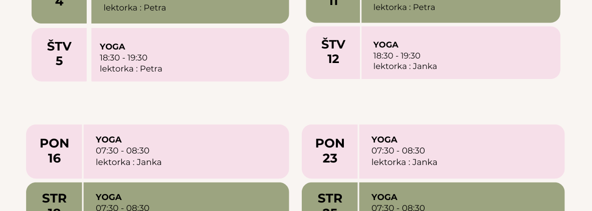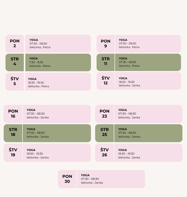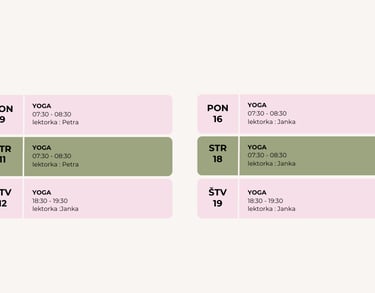 Zastav sa, nadýchni a nalaď sa na seba. Jemné jogové flow ťa prevedú vedomým pohybom, dychom a prítomným okamihom. Vďaka pravidelnej praxi uvoľníš napätie, posilníš telo a nájdeš vnútorný pokoj.