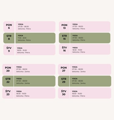 Zastav sa, nadýchni a nalaď sa na seba. Jemné jogové flow ťa prevedú vedomým pohybom, dychom a prítomným okamihom. Vďaka pravidelnej praxi uvoľníš napätie, posilníš telo a nájdeš vnútorný pokoj.